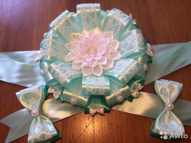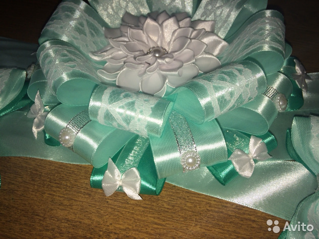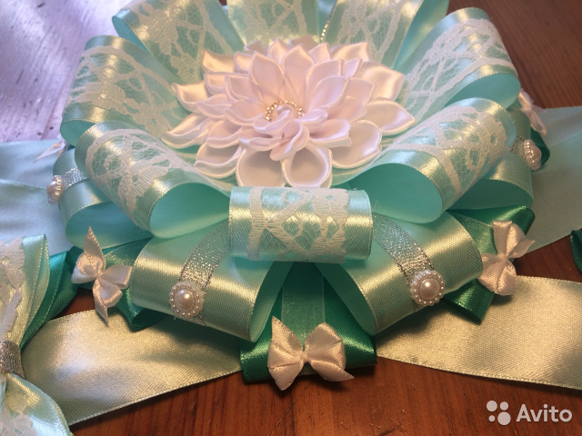 Нежный изумрудный бант - лучшее украшение для вашего маленького свёрточка. Он добавит торжественности празднику, посвящённому выписке из роддома. Бант диаметром 18 см с лентой длиной 2,5 м. В наличии. Также возможно изготовление в любой цветовой гамме по вашему желанию.